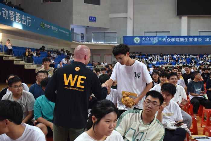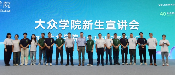 大众学院招生会上,党委委员、教务处处长、大众学院院长王晓峰介绍了大众学院的发展历程、建设成果以及人才培养模式,并讲解了智能制造工程、数据科学与大数据技术、新能源材料与器件三个“双元制”专业的学科建设情况。大众中国学习与发展中心文化及人力资源沟通部高级总监娄屹介绍了大众汽车的企业规模、产业基地、研发中心、企业文化等。大众汽车(安徽)有限公司首席人力资源官邵剑介绍了大众汽车在合肥的发展历程以及发展远景规划。大众学院学生代表陈政扬、熊文泽和程梦雪分享了学习生活感受,校友赵飞洋分享了在大众安徽的工作经历。大众学院直属党支部书记宣跃文和大众中国学习与发展中心负责人潘欣共同为同学们介绍了招生计划、参选条件、选拔流程和报名方式,并逐一解答了新生的疑问。
