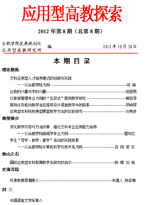 为进一步深化教学改革,不断提高人才培养质量,应用型高教探索8 期以教学方法改革为主题组稿,目录如下,具体内容请查阅发展规划处网站(http://www.hfuu.nbdazhong.com/fgc/),并将您的宝贵意见或建议反馈至我处。