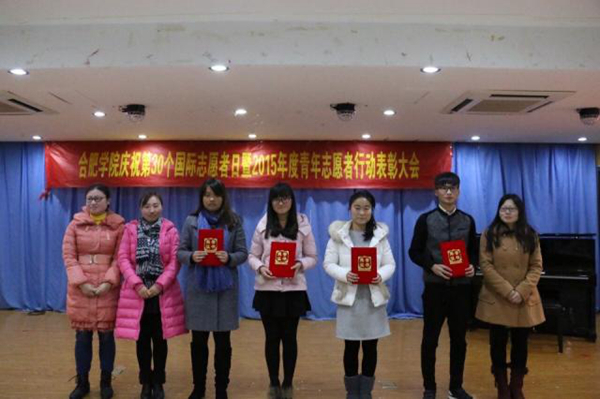 12月5日,我校青年志愿者联合会在大学生活动中心召开庆祝第30个国际志愿者日暨2015年度青年志愿者表彰大会。院团委全体老师、部分系部团总支书记、各系志愿者服务队及安大、安农大、安医大等合肥八所高校青年志愿者代表出席会议。