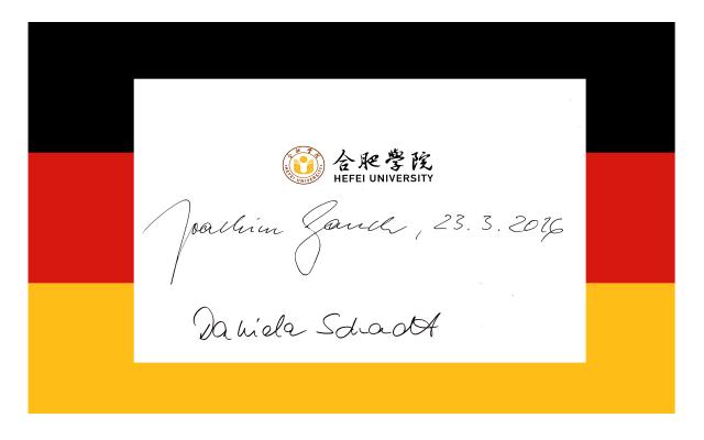 致辞结束后,在德国驻沪总领事罗腾先生的陪同下,高克总统携夏迪特女士与蔡敬民进行了谈话。蔡敬民简短介绍了我校31年来对德交流合作历史、德国总理默克尔与中国总理李克强来校访问情况,以及中德教育合作示范基地建设情况。高克总统对我校持续多年的中德合作给予了高度的评价,并对我校通过与其母校——罗斯托克大学的友好合作关系,积极促进合肥市与其家乡罗斯托克市的友城建设给予了高度赞扬,希望我校继续联合在德友好学校,共筑中德教育合作的楷模,并祝愿我校中德教育合作示范基地建设圆满顺利。夏迪特女士对于我校借鉴德国模式,实践应用型高等教育的举措给予了高度的关注和肯定,希望我校能坚持这一特色,成为德国应用科学大学特色在中国的展示舞台。谈话中,高克总统与夏迪特女士欣然为我校留名点赞。