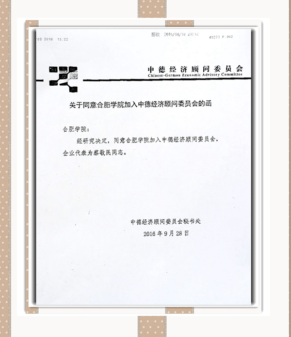 2016年9月28日,商务部中德经济顾问委员会复函合肥学院,正式批准同意合肥学院加入中德经济顾问委员会,代表为学校党委书记蔡敬民同志。合肥学院成为第一个加入中德经济顾问委员会的高校代表。并将于10月下旬参加在北京举行的中德(安徽)产业合作圆桌会议。