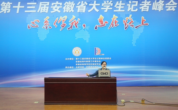 11月6日,由安徽省大学生记者峰会组委会、安徽省青年新闻工作者协会以及安徽省高等学校校报研究会联合主办,合肥学院、安徽青年报社联合承办的第十三届安徽省大学生记者峰会于我校顺利召开。新安晚报记者钟虹为在场来自全省50余所高校的400余名校媒记者带来主题为“推陈出新,论新媒体时代下的纸媒发展”的讲座。