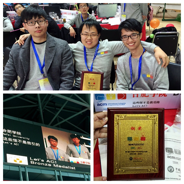 历时2天的第41届ACM国际大学生程序设计竞赛亚洲区域赛(青岛),11月13日在中国石油大学(华东)落幕。来自清华大学、北京大学、香港中文大学、香港科技大学等187所高校327支代表队,从参加今年9月网络赛的1600多支队伍中脱颖而出,共同争夺2017年世界总决赛出线资格。经过激烈角逐,卓越IT工程师俱乐部吕刚、胡春玲两位老师指导的ACM算法创新设计小组的王路路、陆园飞、曹路路3位同学经过5个小时的拼搏最终获得铜奖的优异成绩。