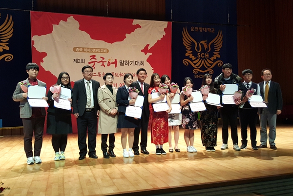 11月3日,“第二届合肥学院杯汉语演讲大赛”在韩国顺天乡大学成功举办。大赛吸引了来自韩国以京畿道和忠清南道地区为主的全国38所高中学校共计46名学生参赛。最终通过层层选拔,18名选手进入到决赛阶段。参赛选手虽然只是高中生,但是他们准确的中文发音,熟练的汉语演讲技巧,贴近生活的风趣内容无不让台下的观众为之鼓掌。从《我的中国梦》到《美丽中国话》,所有参赛选手的演讲主题无不是讲述了他们通过对汉语的学习加深了对中国的了解与喜爱,希望在中国实现自己的理想。每一位参赛选手的精彩演讲都得到了台下评委及观众的热烈掌声。经过紧张的角逐,来自大田广域市的庾诗元同学获得了比赛的冠军。我校在顺天乡大学学习的学生组成了观众评审团,来自我校的四位评委参加了评审工作并为获奖者颁奖。