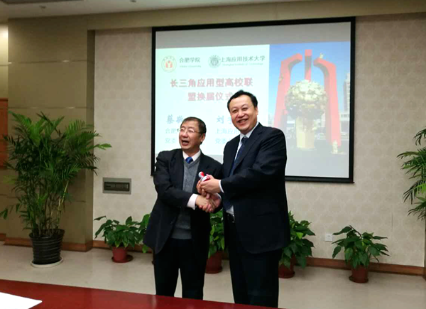 合肥学院作为长三角联盟的常任主席单位及第一届轮值主席单位,作了2015-2016学年工作总结。合肥学院发展规划处缪群道处长回顾了过去一年多来联盟开展的工作,主要包括共同开展大学生创新创业教育、合作推进在线课程共建项目、深入推动高等教育国际化合作水平、研究制定应用型人才培养标准等,并针对长三角地区应用型高校联盟改革和发展过程中的问题,提出了促进长三角地区合作共赢、资源共享的意见和建议。随后会议进行了长三角联盟换届交接仪式,合肥学院蔡敬民书记将联盟公章亲手交给上海应用技术大学刘宇陆书记,并握手留影。