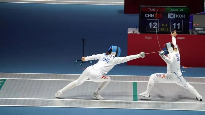 在1/4决赛中,中国队以45:39的比分,轻松战胜哈萨克斯坦队进入半决赛。在半决赛,面对实力强大的韩国队,中国姑娘们迎难而上,唐君瑶在比赛中表现出的冲劲让人印象深刻。“中国队加油!”中国队每获得一分,现场都爆发出雷鸣般的加油呐喊声,双方比分一直咬得很紧。最终中国姑娘们以总比分27比30遗憾负于韩国队,止步半决赛,获得铜牌,这也是我校学子在今年8月夺得成都世界大学生运动会女子重剑金牌和男子重剑银牌后的又一块国际重要赛事奖牌。