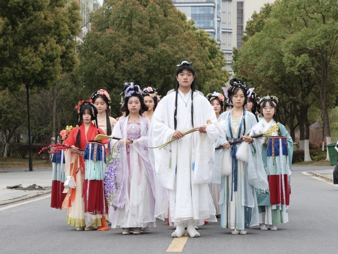 春日傍晚,学生们身着各式汉服,手持花灯,展示着“服章之美”。衣袂翩翩,宛若惊鸿,巡游队伍像一幅唯美的古典画卷在校园内徐徐展开。正值春色满园,巡游队伍在艺术楼前开展了十二花神走秀和舞蹈表演。伴随着优美的旋律,十二花神广袖飘飘、衣袂摇摇,为大家呈现了一场精彩的视觉盛宴。夜幕降临,五颜六色的莲花河灯被放入湖面,灯光水影摇曳,如繁星点点。此次花灯节还特别设置了书法、绘画、投壶、赏灯等活动,为同学们带来了多元体验。盛开的丁香与端庄的汉服交相辉映,绘出了一幅校园三月春景图。
