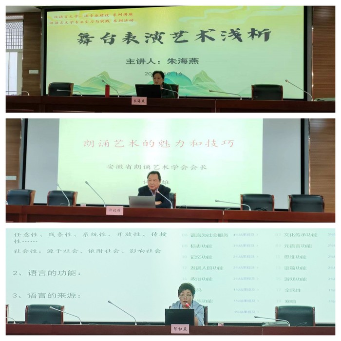 10月17日至25日,学院先后邀请了原安徽省话剧院院长、国家一级演员朱海燕,安徽省朗诵协会会长、国家一级演员许北雄,文传学院副教授、语言学及应用语言学博士陈红燕等专家开设了“舞台表演艺术浅析”“浅谈朗诵的艺术魅力和基本技巧”“语言与生活”系列讲座。