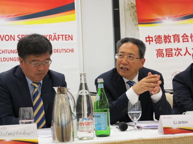 Am Vormittag des 14.06. fand ein Treffen von Spitzenkräften der Modelleinrichtung der Bildungskooperation zwischen China und Deutschland in Hannover statt. Prof. Dr. Cai Jinmin, Parteisekretär der Universität Hefei, hielt dabei eine Rede. Dr. Li Jinbin rechnete in seiner nachfolgenden Rede der Universität Hefei hoch an, dass sie als Brücke bei der Förderung der chinesisch-deutschen Bildungskooperation eine wichtige Rolle spiele. Er zitierte Ministerpräsident Li Keqiang und teilte seine Hoffnung, dass die Kooperationen der Universität Hefei auch in Zukunft, so wörtlich „wie ein starker Baum mit tiefen Wurzeln“ sein mögen.